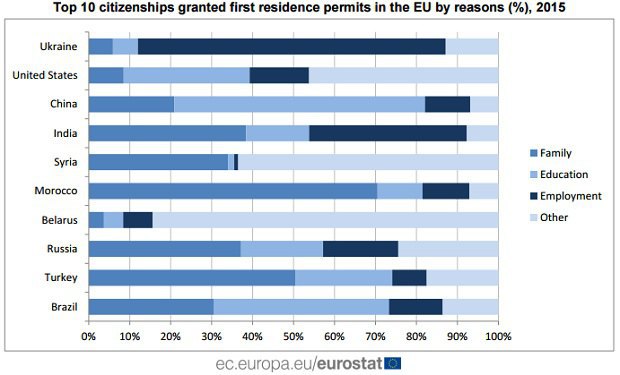 Майже 500 тис. українців отримали посвідку на проживання (дозвіл на постійне проживання) в ЄС в 2015 році. Крім того, у
